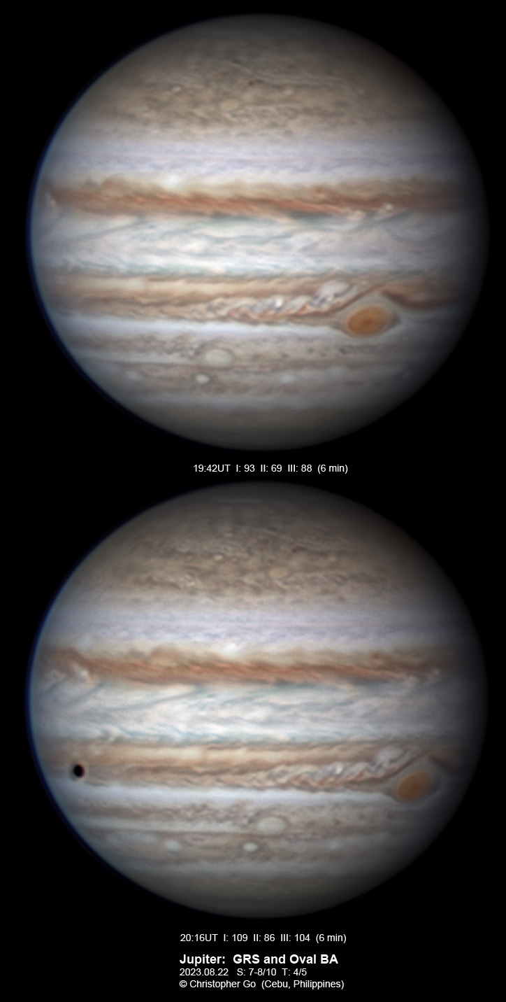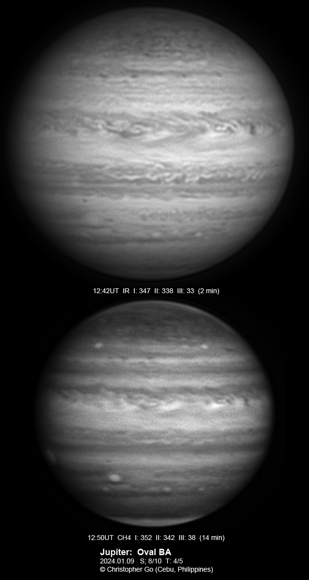 Here are images of Jupiter with the Oval BA. The SEB and NEB are quiet in this region. There is a large dark red cyclonic spot on the NEB at the CM.