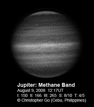November 30, 2008 Condition was terrible because of heat plumes from my roof. Jupiter is not very close to Venus. The SEB has some activity. Both the SEB and NEB are very ready. The white ovals on the northern edge of the NEB are very prominent. I was confused that the dark "shadow" at the NTB was bright in methane band. Checking Winjupos, I found out that the shadow is the dark moon Callisto itself! Note the dark banding at the NNTZ. All in all, it seems that Jupiter is quiet now after the turbulent upheaval last year. The color of the SEB is now the same as the NEB. Only the southern temperate area is still pale.