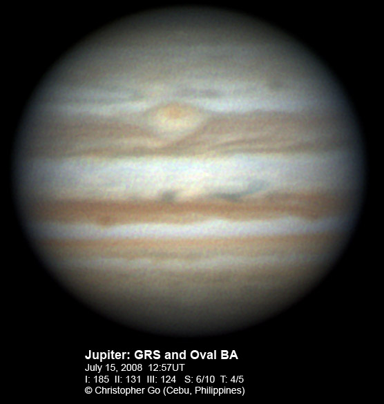 July 5, 2008 Seeing and transparency was horrible. There was a light shower during the start of the session. I was having second thoughts whether I should image or not. I was only able to get 1 image before clouds rolled in! The Oval BA is now in conjunction with the GRS. The LRS just went between the GRS and Oval BA. Note the reddish protrusion southeast of the GRS! Is the the LRS remnant?