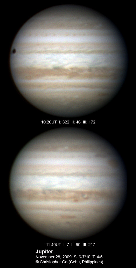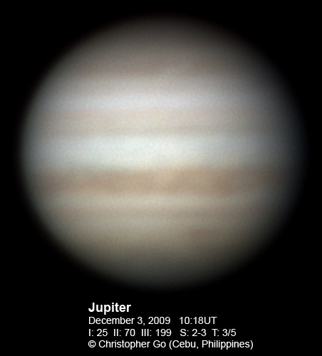 26, 2009 Merry Christmas everyone! Jupiter is less than 40deg above the horizon. I hope to have a few weeks more of decent images of ol Jove. Oval BA is very dark. Note the white spot following it is still pushing towards BA. The cyclonic oval between BA and the white spot has turned dark red. Note another white oval moving towards the white oval following BA. The SEB is very pale. The mid-SEB activity is very prominent. Io's shadow is at the EZs. The "fan" on the shadow is due to distortion because of bad seeing. The NEB is very dark red. The NEB darks spots are still prominent. Note the dark barge on the NTBn. The NNTZ LRS is prominent. The red ring is even resolved.