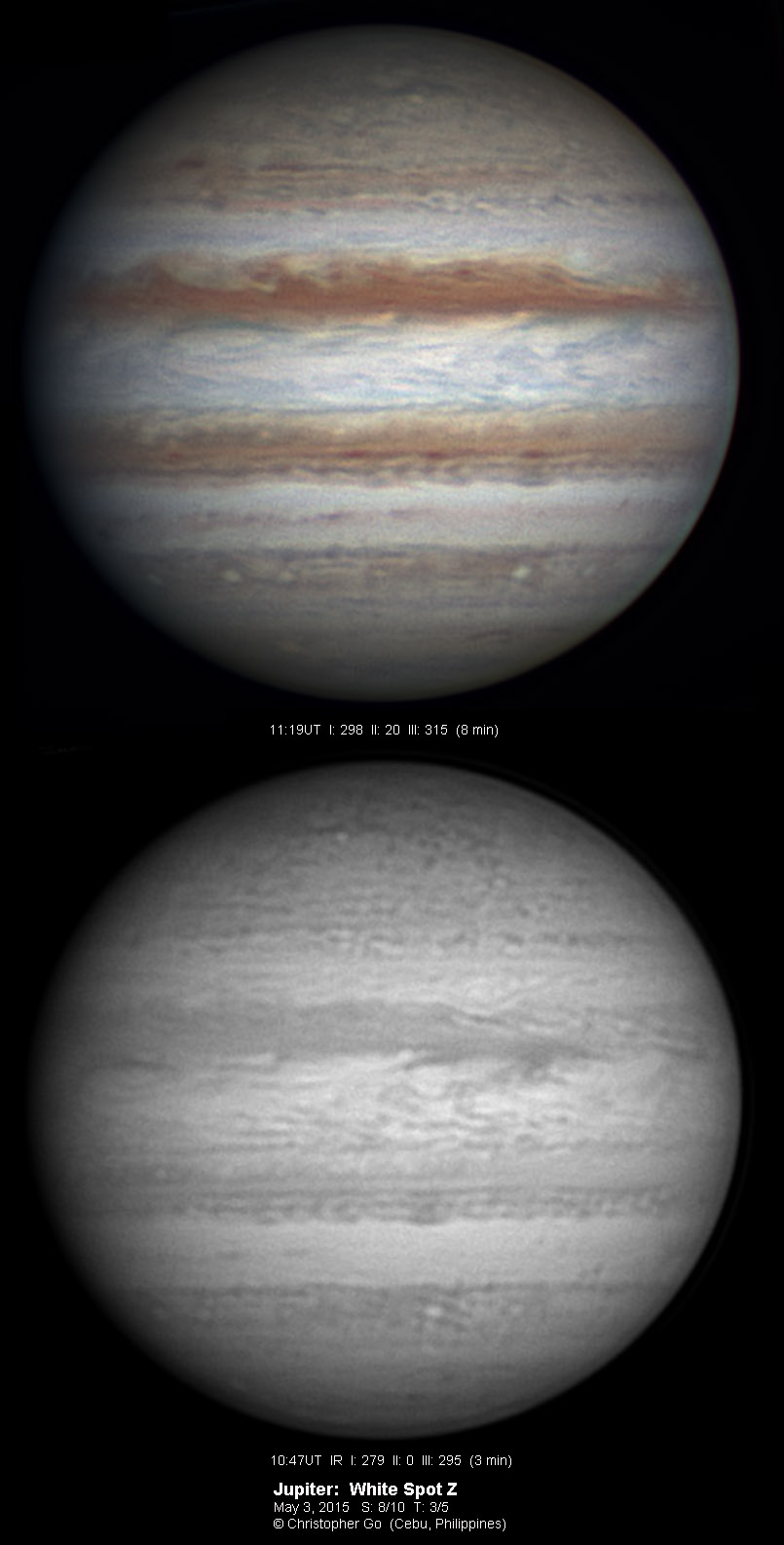 Seeing was better this evening. But transparency was poor because of clouds! The White Spot Z is prominent in these images. There are some very dark red spots on the NEBn. Note the reddish band on the NTB. The SEB looks quiet in this region.