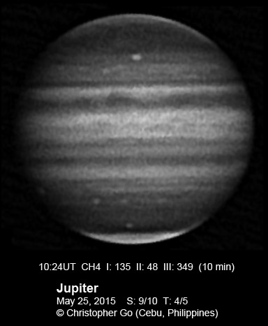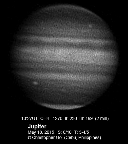 JUPITER 2014/2015 SEASON By Christopher Go Late start on Jupiter this year. Hoping for an exciting year with Jupiter. The GRS is shrinking! All images were taken using a Celestron C14 mounted on an Astrophysics AP900GTO mount. A Celestron Skyris 132M was use until April 2015. Starting May 2015, I used a Skyris 236M camera. RGB is done using a set of Chroma Technology RGB filters on a Starlight Xpress Motorized filter wheel. Methane band images are done using a Chroma Methane Band filter (889nm 18nm bandpass). UV images are done using a Astrodon UV filter. Amplification is done using an Astrophysics Convertible Barlow working at 2.0X. Image acquisition was done using Torsten Edelmann's Firecapture 2.4 software. All images are NORTH UP! The Skyris camera is controlled by a Thinkpad T520 through the USB port. Processing was done using AutoStakkert! and Registax. These images were taken at Banilad, Cebu City, Philippines. For more information on the names of various belts and zones of Jupiter and the meaning of the abbreviations I use please check the Sky and Telescope Jupiter Observing Guide. All images of this site are my property. If you wish to publish it on your site or print, please email me for permission. |