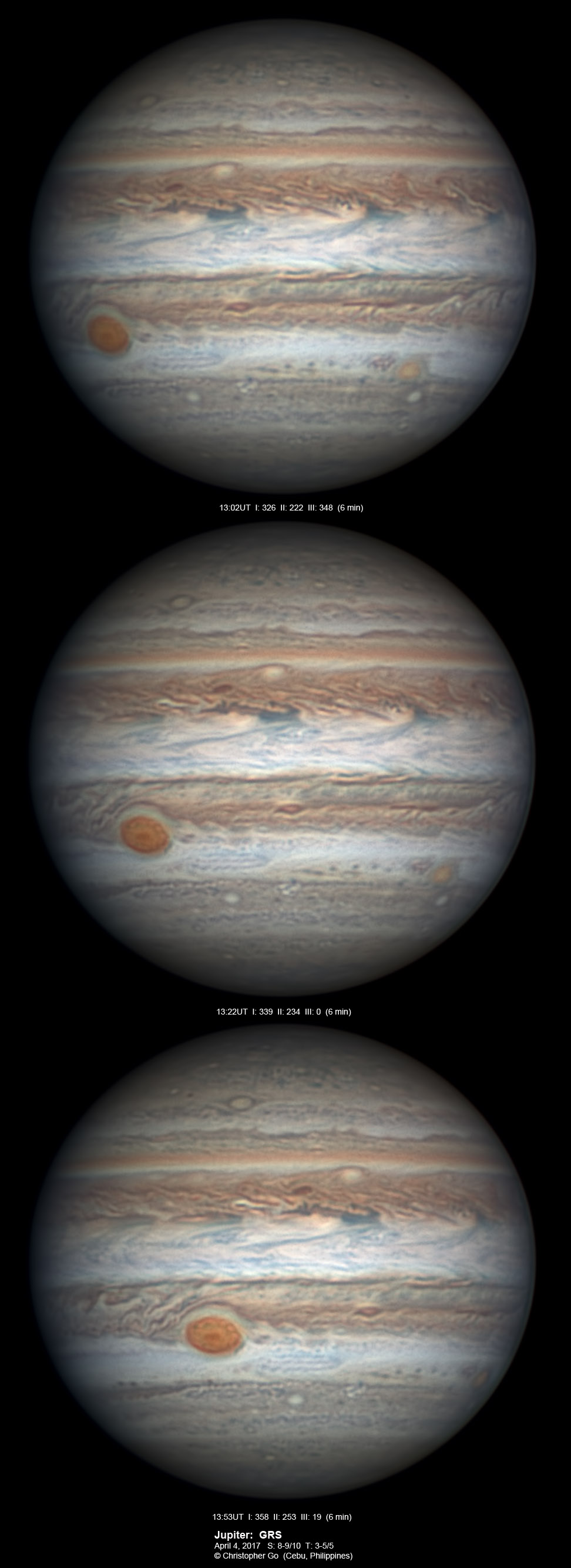 2017 Seeing was perfect today but transparency was poor due to clouds. The GRS is well resolved in these images. Note the details inside the GRS. There are some IR bright spots inside the GRS. The STB Ghost is still very dark in CH4 band. Note the light blue feature north of the STB Ghost. Some white spots can be seen in the South Pole. The dark red spot preceding the GRS is very dark in CH4 band. Note the reddish spot on the NEB. This spot is bright in CH4 band.