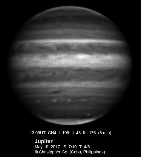 2017 The sky cleared today. Condition was challenging because of strong winds and clouds. But seeing was quite good. The GRS is well resolved. The light blue disturbance caused by the STB Ghost is still there. The STB Ghost is not as dark in CH4!! Except for the dark part close to the GRS, the other parts seem to be fading! Note the trio tiny ovals on the SSTB! Will they merge into one? The NEB is still active with a lot of outbreak activity. It is nice to see the tiny ovals in the area close to the poles.