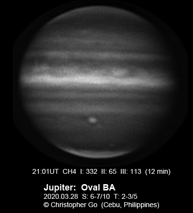 2020 I overslept today and did not wake up till 4:20am! I was not able to catch the GRS today. Seeing was only average today. The GRS is setting on the right. Oval BA is prominent in these images. A dark ring can be seen inside Oval BA. The South Polar Red Spot is prominent below Oval BA. The NEBn is very disturbed! While the SEB is very pale!