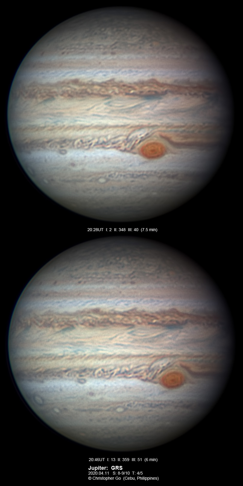 2020 I woke up early today with a game plan. Take a quick imaging run with Jupiter. Then take a complete run with Saturn. Then back to Jupiter to capture the GRS. Unfortunately things did not go as planned. Seeing was perfect. But in the middle of my Saturn capture, clouds rolled in. I had to rush to image Jupiter in between clouds but was only able to capture 2 sets under low transparency. Fortunately, I was able to salvage the image despite the less that ideal conditions. During the first run, the image shows a pale SEB with the GRS rising on the left. Note the bright white feature on the mid SEB at the CM of the first image. I wonder what that feature is? The NEB is dark and narrow. Note the very dark festoon at the CM! On the second image, some flaking can be seen on the f side of the GRS. The small white oval above the GRS seem to be stuck at the "chimney".