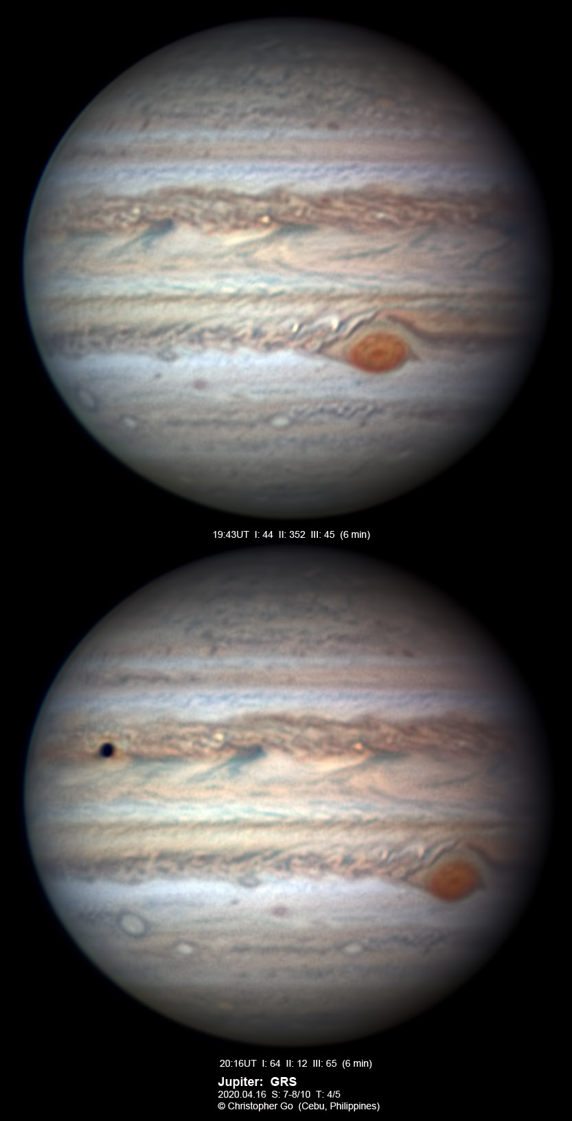 2020 Condition was good this morning. The GRS can be seen rising on these images. The SEBn is very turbulent due to interaction of the GRS with the SEB. There is a reddish haze on the EZ. The NEB is dark. Note the bluish streaks on the STB. Is this the STB Ghost or Spectre?