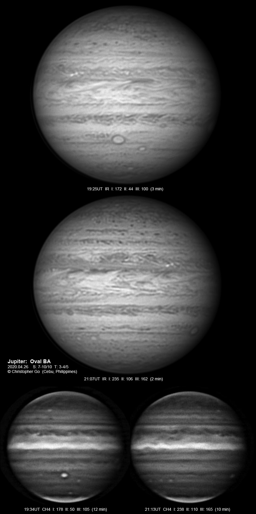 2020 TS Nuri (Butchoy) ruined the weather here. Although it never got close to us, it brought rain for the last few days. I was happy that there was some clearing today. Condition was not ideal as I had to image through clouds and seeing was average. The images show the GRS and Oval BA. The GRS shows flaking at the f side. This flake is visible in the methane band image. It also looks like the chimney above the GRS is now open! In methane band, one can see a bright spot entering the chimney! The outbreak on the wake of the GRS is still active. The area of Clyde's spot is at the edge and there seems to be darkening in that feature. Oval BA is still very pale. There is an interesting feature on the mid-SEB above Oval BA. Is that a cyclone? This seems to be disrupting that area on the SEBs. The South Polar Red spot can be seen below Oval BA. The NEB continues to look strange. The NEBn has faded.