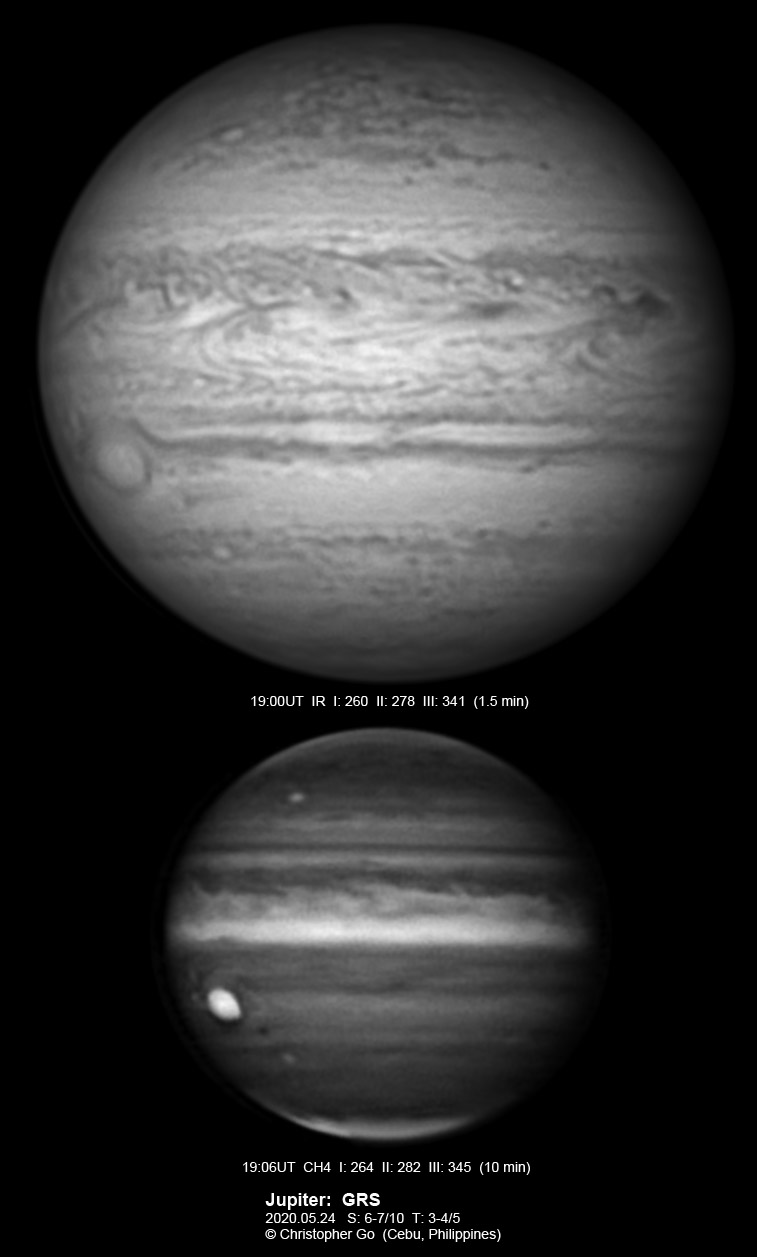 2020 Seeing was good today. I finally have some decent images of Jupiter! The GRS is prominent on these images. Seeing was so good that details inside the GRS are well resolved! As Niall has mentioned in his observations, the chimney above the GRS is open! The GRS halo and chimney are bright in methane band! The wake of the GRS is very turbulent and bright outbreaks can be seen developing! Note the reddish streak on the STrZ on the immediate SW of the GRS. The southern NEB is very dark red. The northern part of the NEB is seem to be fading. The NNTZ LRS is prominent. A hint of the red ring can be seen.