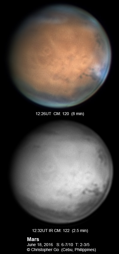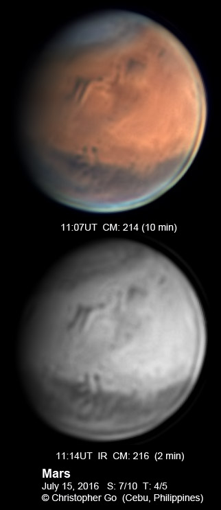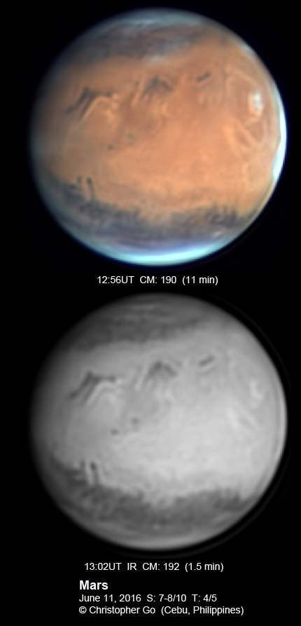 | May 16, 2016 Just came back from the Juno Amateur Conference in Nice, France. I will be travelling to give a Planetary Imaging workshop at the Canadian Astrophotography school today. Seeing and transparency was variable. Those who will be attending my class will have an opportunity to play with the raw data of these images! The Solar System's largest volcano, Olympus Mons can be seen close to the center of Mars. The Tharsis volcanoes: Arsia Mons, Pavonis Mons and Ascraeus Mons can be seen lining up on the lower right of Olympus Mons. Solis Lacus can be seen setting on the lower right. Mare Sirenum is on the south.