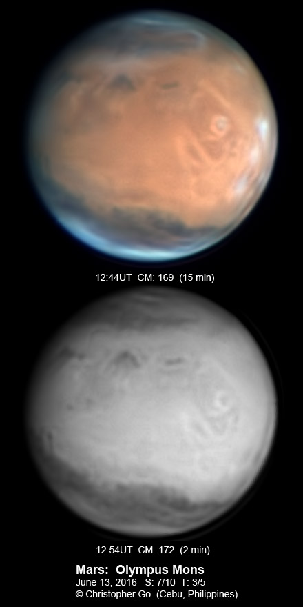 | June 15, 2016 Perfect conditions today. Olympus Mons is well resolved and cloud free. There are clouds over the Tharsis volcanoes. Note the bright streaks on Tharsis. The polar regions are very cloudy.