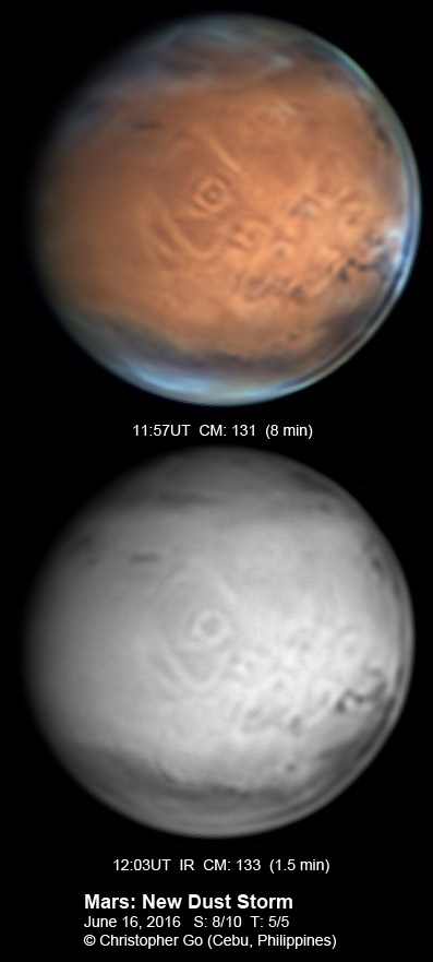 | June 16, 2016 Seeing was good this evening. There is a new dust storm starting at the Palinuri Sinus. This storm was just a small oval which has risen over the cloud level! You can see the storm at the bottom of Mars mixing with the clouds. Note also the yellowish color of the clouds on the North Polar area on the right. Another dust storm? Olympus Mons is well resolved. The caldera is resolved! The 3 Tharsis volcanoes are now cloud free. Solis Lacus is now setting on the right.