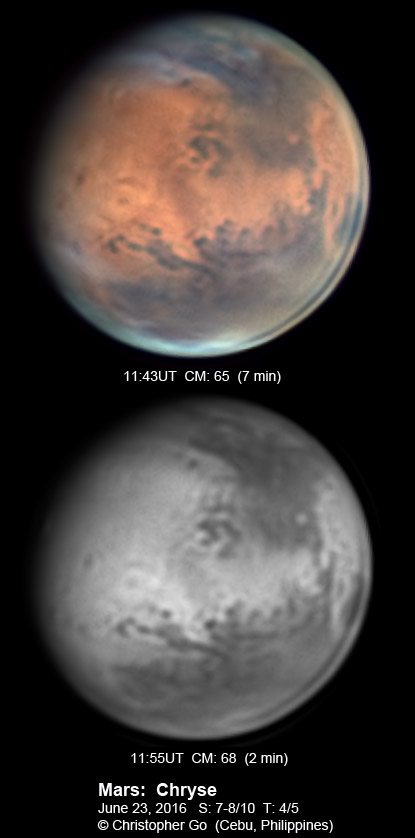 | April 23, 2016 Seeing was variable this morning. But I finally got some decent Mars images. The Chryse region is rising on the left. Sinus Sabeaus and Sinus Meridiani can be seen on the center right. Syrtis Major can be seen on the western edge of the first image with the famed Syrtis blue cloud.