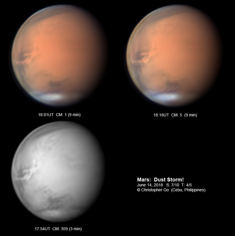 | June 14, 2018 The SW monsoon is at full swing here in Cebu. Seeing was very unstable. Weather has been so bad here that I had a late start with Mars. I was a bit perplexed when I saw Mars. I could hardly recognize it! The dust storm has covered Sinus Meridiani where the Mars Rover Opportunity is located. Unfortunately, NASA has lost contact with this rover. I hope the rover will survive this storm! This dust storm seems to be moving towards Chryse! Note the bright clouds over Mare Australe.