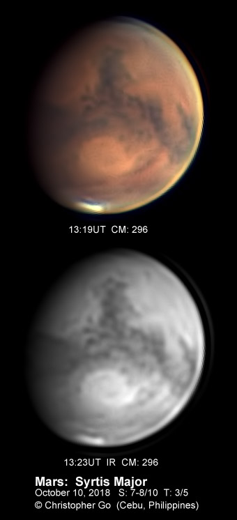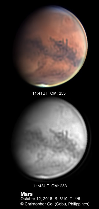 | August 12, 2018 It has been close to a month since my last image. Monsoon here has been terrible due to multiple tropical cyclones. I had a lucky break tonight. Seeing was poor though and transparency was variable. The dust storm seem to have subsided in this region. Solis Lacus is distinct. What is surprising is the the Tharsis Volcanoes are difficult to see. Olympus Mons is barely visible as a dark smudge on the upper left in the color image.