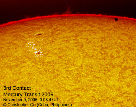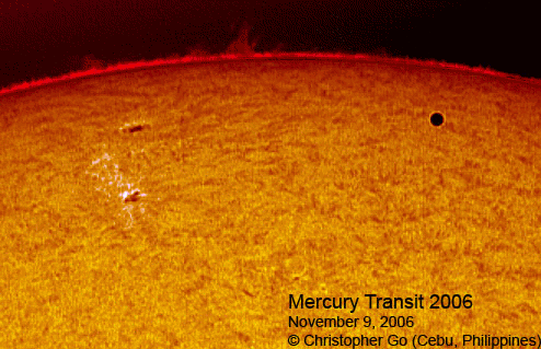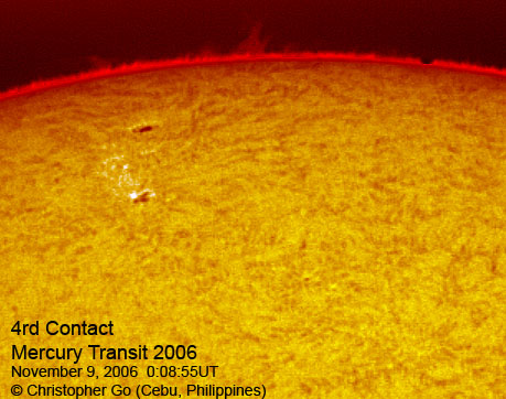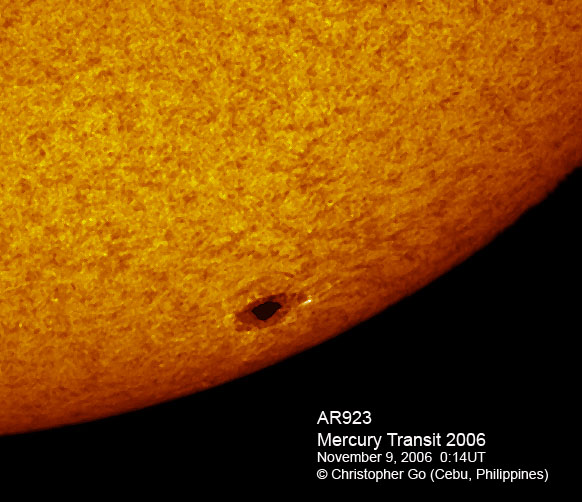 Philippines.I am using a Solarmax 60 Hydrogen Alpha Filter attached to my Astrophysics AP130EDF refractor. For imaging I used trusty DMK 21BF04 camera. Tomio used his C8 with Baader Planetarium Astrosolar density 5 filter and his Canon Digital Rebel XL camera. Seeing was around 9/10 with 4/5 transparency. Mercury was already past maximum transit during sunrise. Sadly I wasn't able to capture because of low clouds. I was able to get a good record on the last 10 minutes of the transit. As a bonus, sunspots AR921 and 922 are in the field of view of Mercury. Including some small fireworks from AR922! Also another surprise was AR923 rising which is a huge sunspot. After the Transit, Tomio and I were very exhausted because of the heat but we were very happy! This will be the last Mercury transit visible in the Philippines till 2032. But this is the 4th Mercury transit I have observed and Tomio's first! |