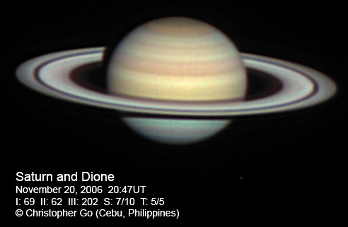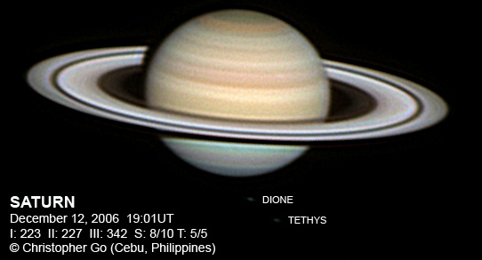 November 27, 2006 Seeing was not great this morning at around 7/10 because of an incoming Typhoon Durian. Sadly this system is expected to become a Super Typhoon in a day or two. Luckily it won't hit my area, but the Northern Philippines might not be so lucky. Tethys and Dione are visible in this image. The NNTZ is still visible but very faint. This belt is so seeing dependent. The northern hemisphere is still bluish. The crepe ring is very prominent in this image.
