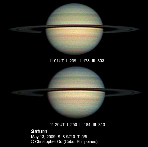 May 11, 2009 Condition was okay this evening. It's been almost a month since my last image. Weather here hasn't been great and I was very sick most of last week. No, it wasn't swine flu. A lot has changed with Saturn. As many have noted, the rings have dimmed a lot. The rings are wider so much so that you can see the Cassini Division all around! Note the curing shadow on each edge of the disk. The SEB is very distinct. I was even able to see this visually with my new WO Binoviewer which saw first light this evening.