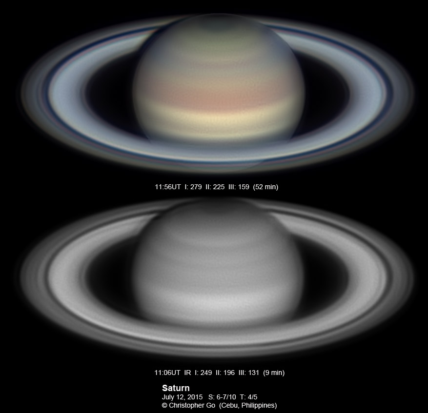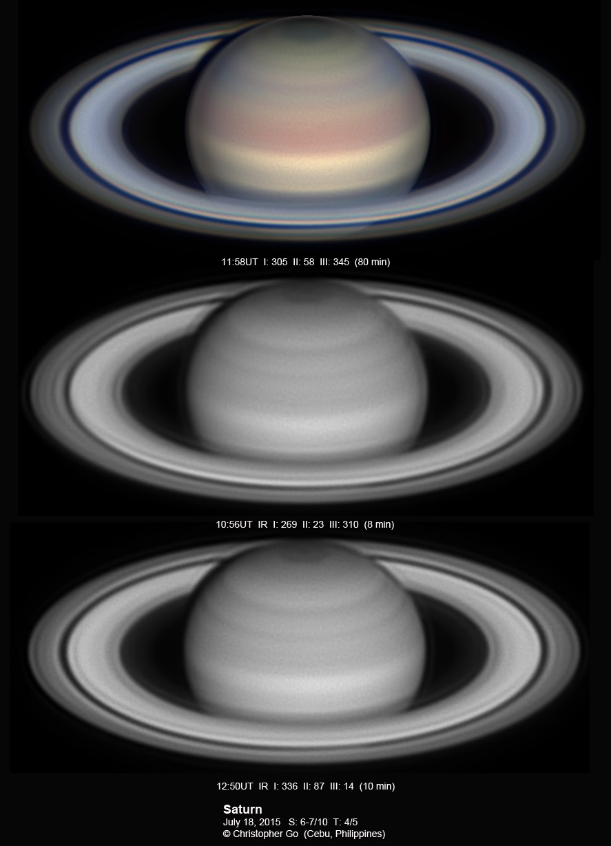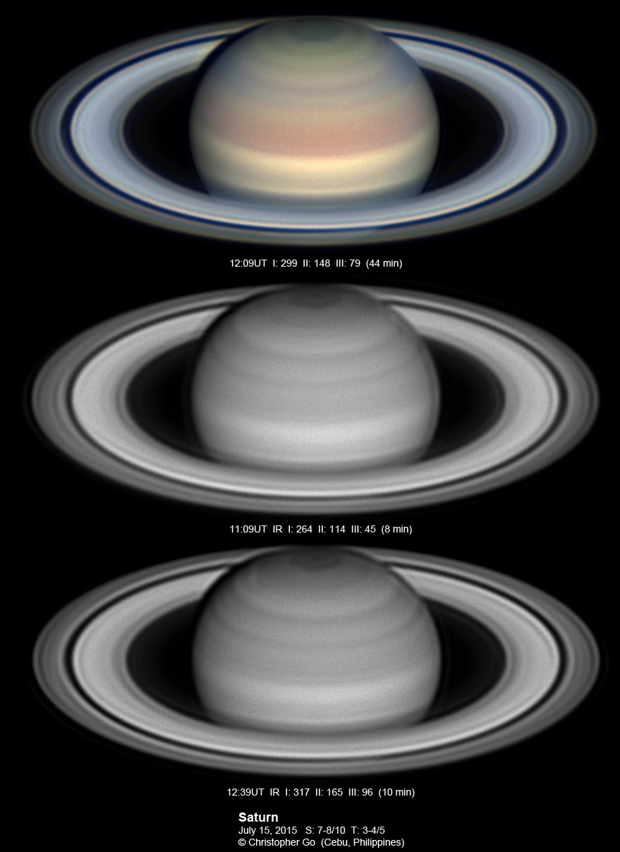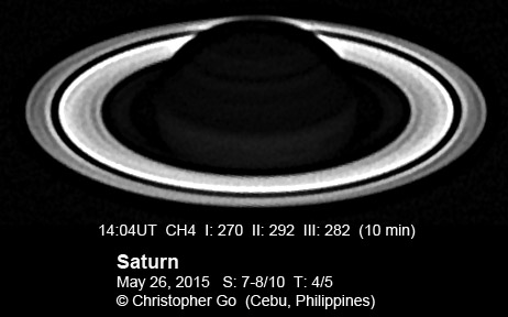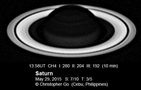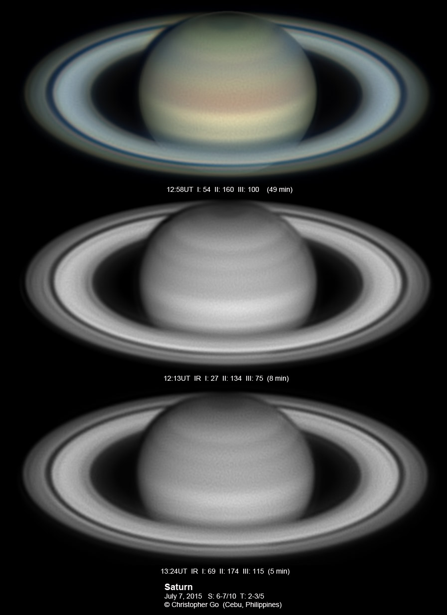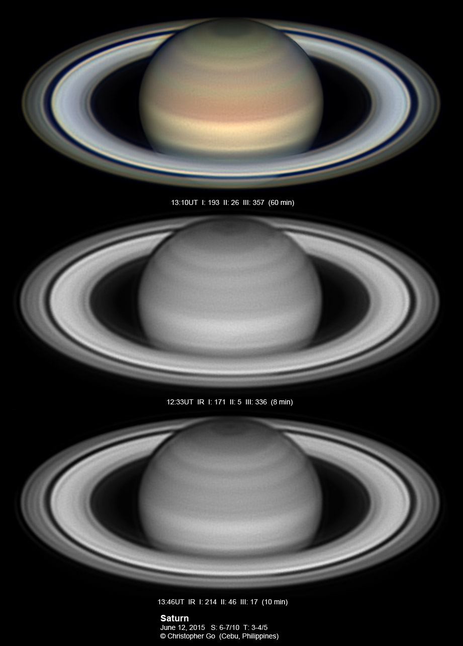 2015 It has been very wet here in Cebu since my last imaging run. I had some clearing but seeing and transparency was very poor! Monsoon season has started here! No interesting feature on Saturn this evening. In the RGB image, the southern pole of Saturn can be seen through the rings!