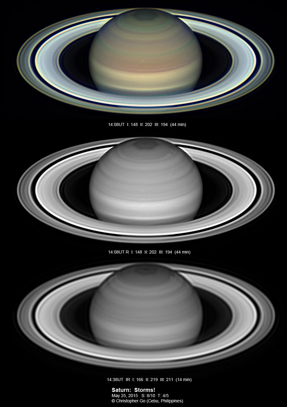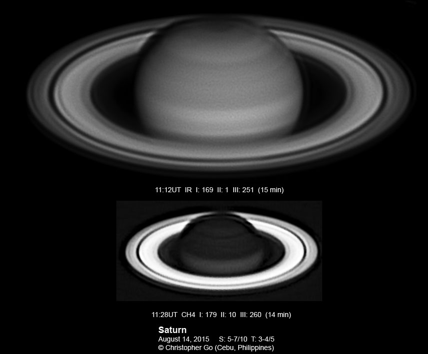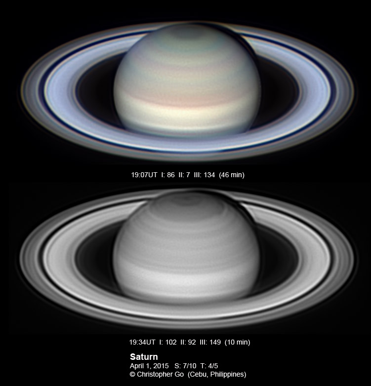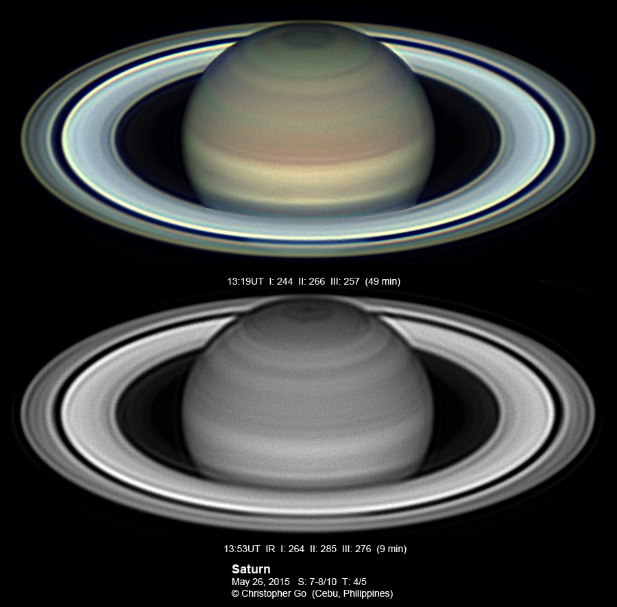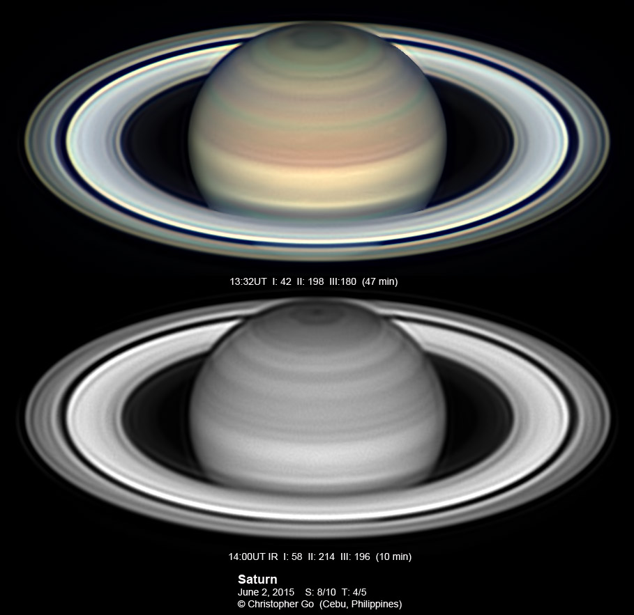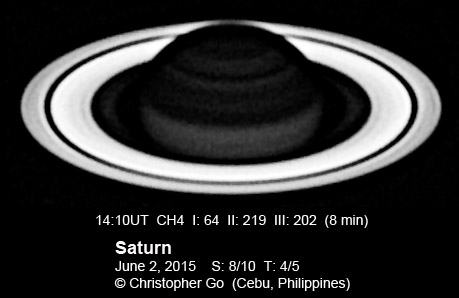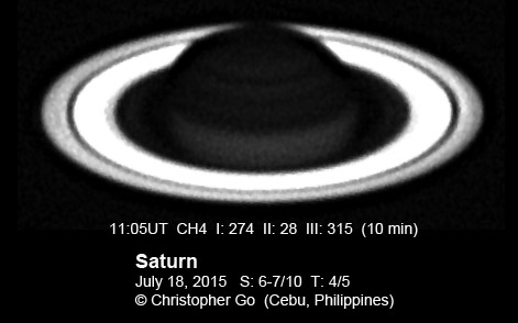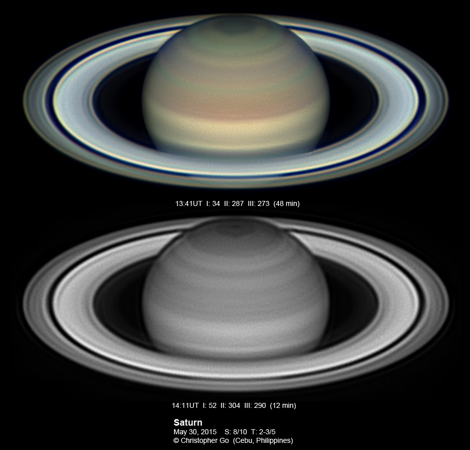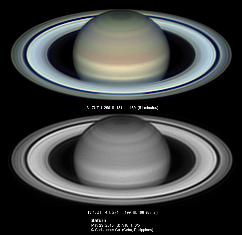 2015 It has been very wet here in Cebu since my last imaging run. I had some clearing but seeing and transparency was very poor! Monsoon season has started here! No interesting feature on Saturn this evening. In the RGB image, the southern pole of Saturn can be seen through the rings!