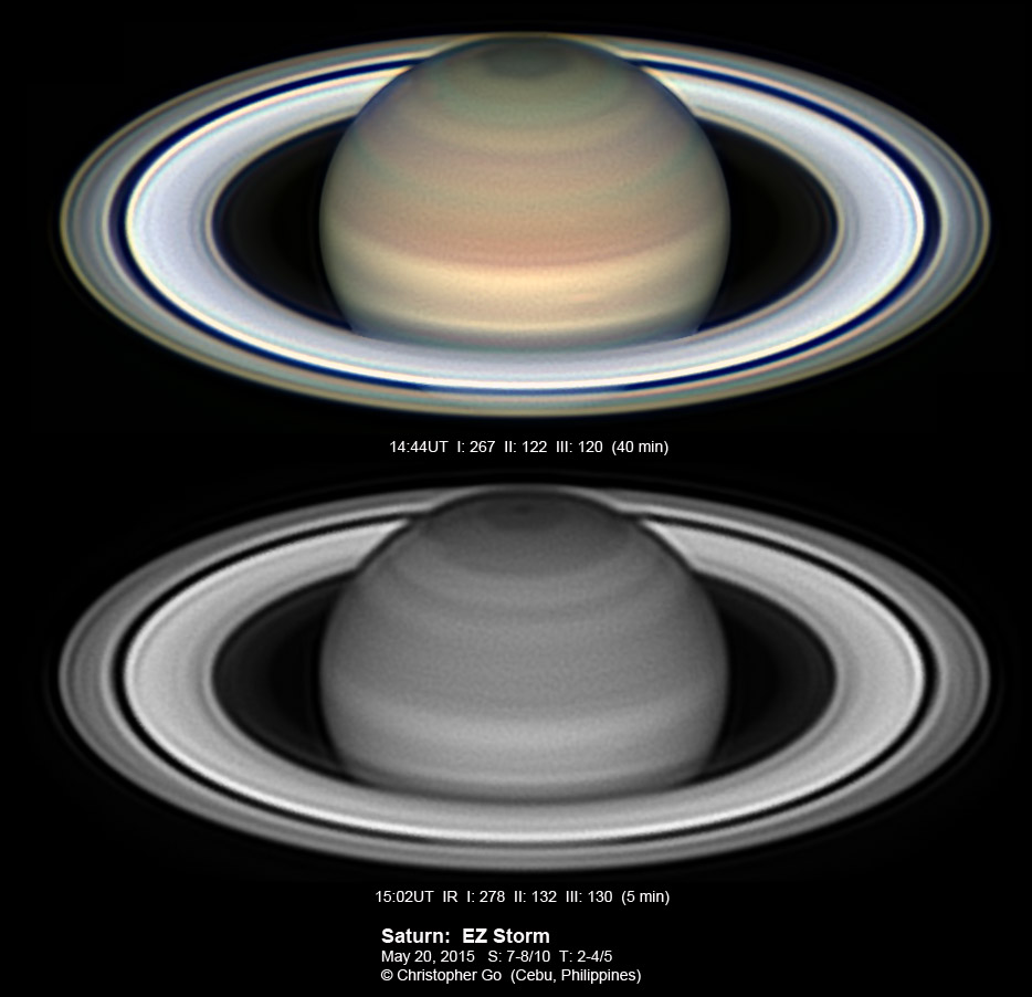 2015 I had a crazy imaging session. The sky was mostly clear when I started setting up. But when I started imaging, clouds started to roll in. In fact, it was mostly cloudy today except in a 20 deg area around Saturn. And it stayed that way for almost an hour. Transparency was variable because of the clouds. On most interesting thing in these images is a bright storm on the EZn! This storm is clear in the raw images. The dark polar spot is very prominent in the IR images. The polar hexagon is also prominent.