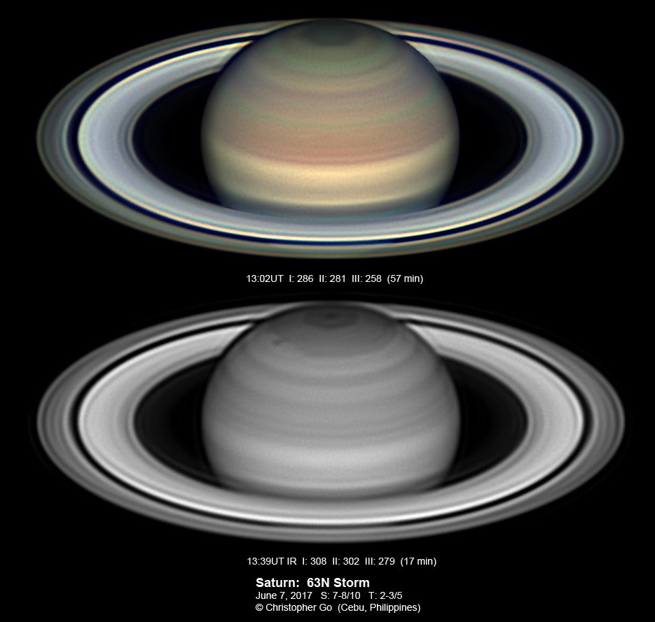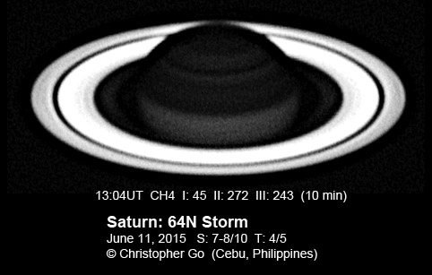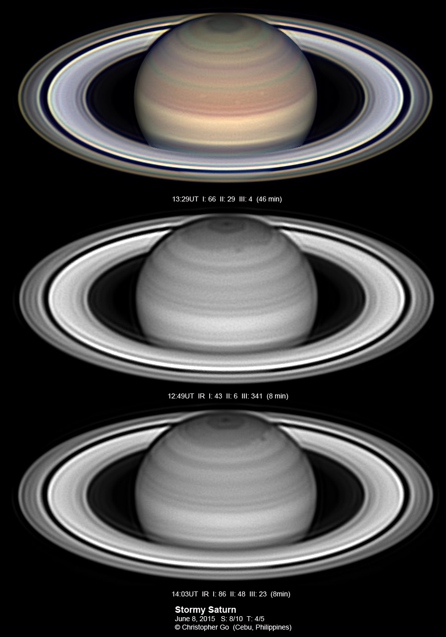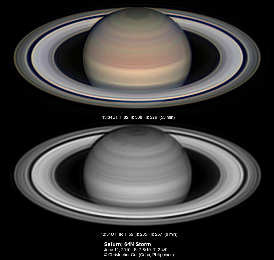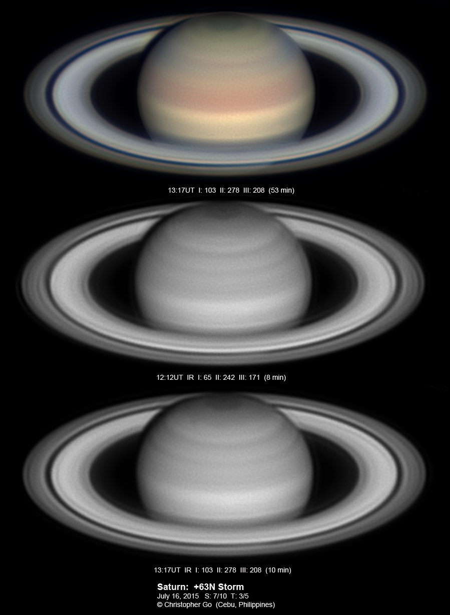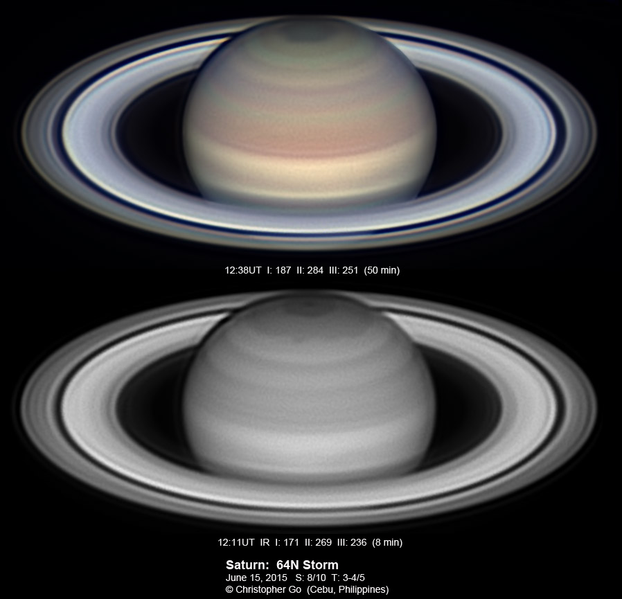 2015 Condition was perfect this evening! But taking these images was exciting because there was a big thunderstorm about 10 miles north of my location and this storm system was moving towards me! These are some of my best images of Saturn. It was stormy north of my location and this region of Saturn is also very stormy! The 64N storm is just past the CM. In the IR, it is a dark spot. In visible light it is dark spot while the area surrounding it has a reddish color. This spot is not bright in CH4! Note the 3 white spots on the NEB. Note also the thin reddish wavy band on the EZ.