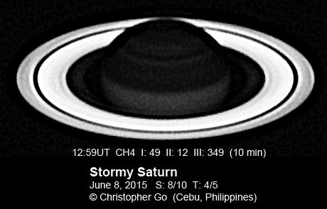 2015 Condition was frustrating this evening! Seeing and transparency was perfect when I started imaging. I started taking IR and the CH4 images. But when I started taking the color images, clouds started rolling in! I had to take images in between clouds and stacked all the data. The 64N Storm is prominent in the IR image. Note the area at the edge of the clearing which looks disturbed. This storm is very low contrast in color images and not visible in CH4.