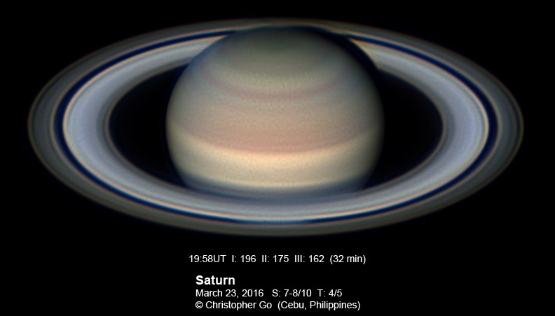 2016 Condition was very good this evening. But I had to deal with some clouds. The Polar Hexagon is very prominent. Note the dark spot on the S3TB. There are low contrast white spots on the surface of Saturn.