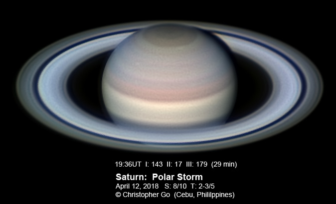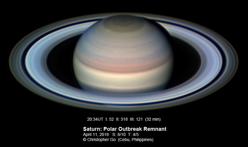11, 2018 The sky was mostly clear when started imaging. I was so engrossed with my computer screen when all a sudden, it started to drizzle! In panic, I had to cut short my imaging run! Seeing was good though. The remnant of the polar outbreak is distinct in this image. It is still a white spot. The Polar Hexagon and the polar vortex is well resolved. |