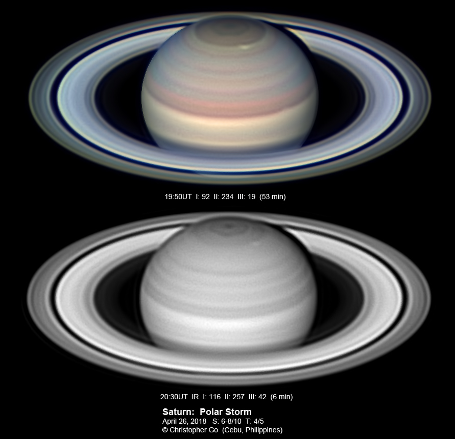 19, 2018 I had close to perfect conditions this morning. Seeing was perfect but I had to deal with some clouds during the middle my RGB run. This is an image of a stormy Saturn. The Polar Storm is very bright and seems to have spread out! There is a bright reddish EZ storm. This storm is very prominent in the R channel. There is another small storm in the temperate area south of the Polar Storm. The Polar Hexagon and the Polar Vortex is distinct in the IR image.