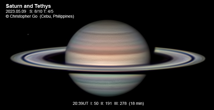 | May 9, 2023 There was a huge thunderstorm headed my way. But the area around Saturn was clear. Seeing was very good. Because of the low noise of the QHY5III678M, it was possible to capture a decent image. The southern hemisphere is getting active as it is heated up by the sun. The northern hemisphere looks quiet in this region. Tethys can be seen on the left side above the rings.