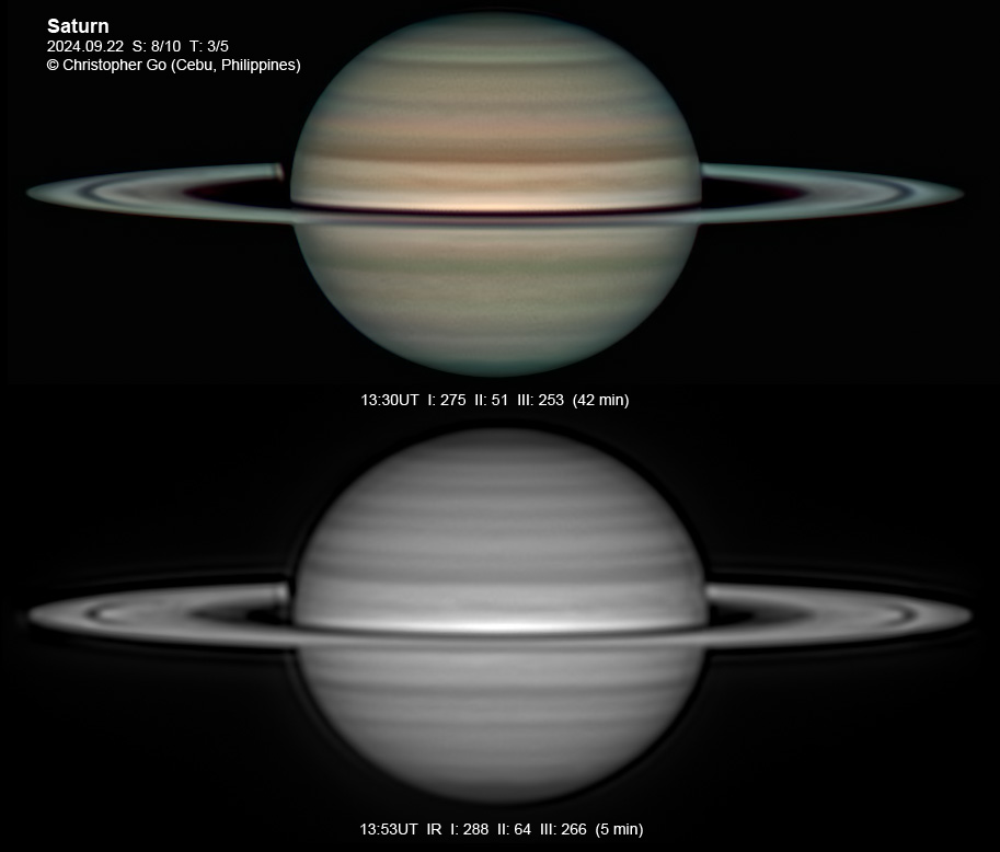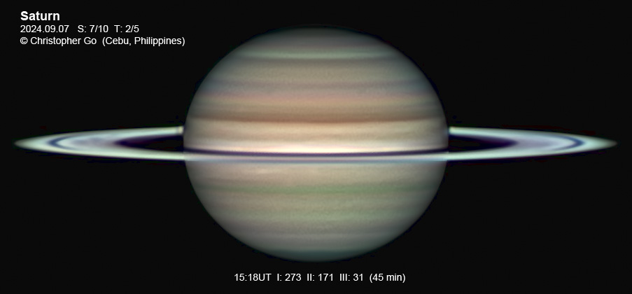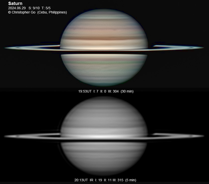 around 73deg here in Cebu. These images were taken using a Celestron C14 mounted on an Astrophysics AP900GTO mount and a QHY5III678M and the QHY5III585C camera. RGB is done using a set of Chroma Technology RGB filters on a Starlight Xpress Motorized filter wheel. Methane band images are done using a Chroma Methane Band filter (889nm 18nm bandpass). Amplification is done using an Astrophysics Convertible Barlow working at 2.5X. I use an Prima Luce ESATTO 2 focuser. Image acquisition was done using Torsten Edelmann's Firecapture 2.7 software. All images are NORTH UP! Processing was done using AutoStakkert! and Registax. For info on Saturn's belts and zones please click this link. You can also see my past images of Saturn at the ALPO Japan Kansai Branch site.