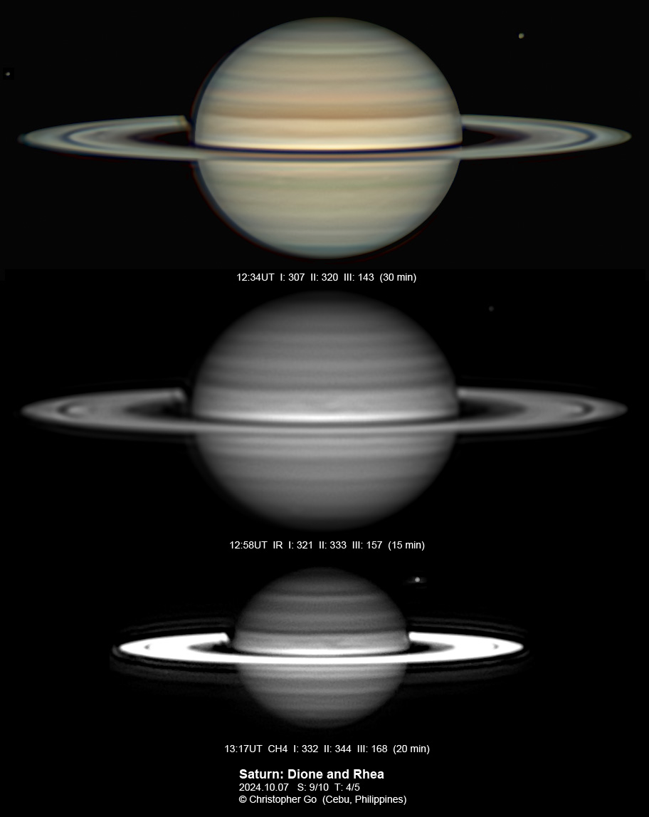 October 7, 2024 Conditions were very good today. The sky was very stable despite the slight haze. All these images were captured using a QHY5III585C camera. I was finally able to capture a descent methane band. The QHY5III585C is really an incredible camera. I just had to get enough data to capture the surface of Saturn in methane band. Note the dark cloud on the EZn at the CM in methane band. There is a hint of this on the IR image but not on the color image. On high contrast images, the SEBs is lined up with white spots. The moons Rhea (right) and Dione (left) can also be seen.